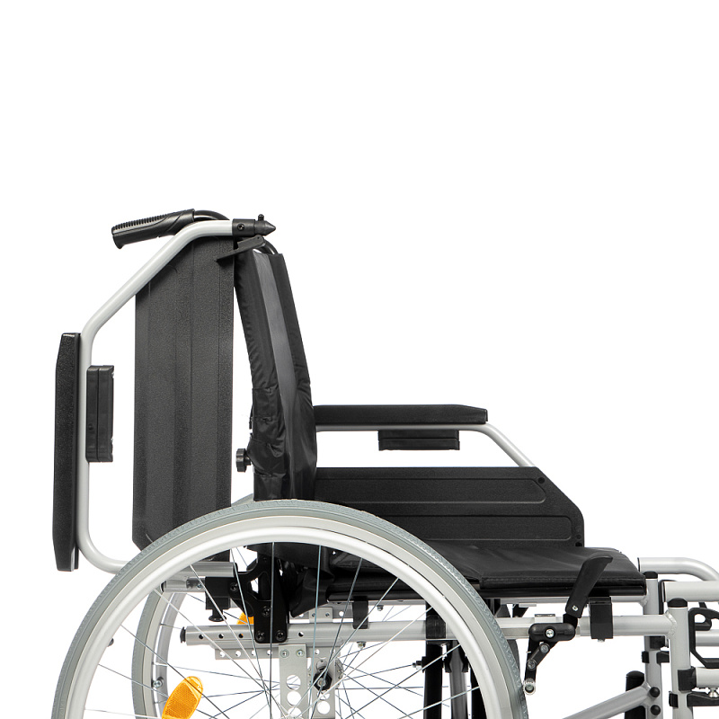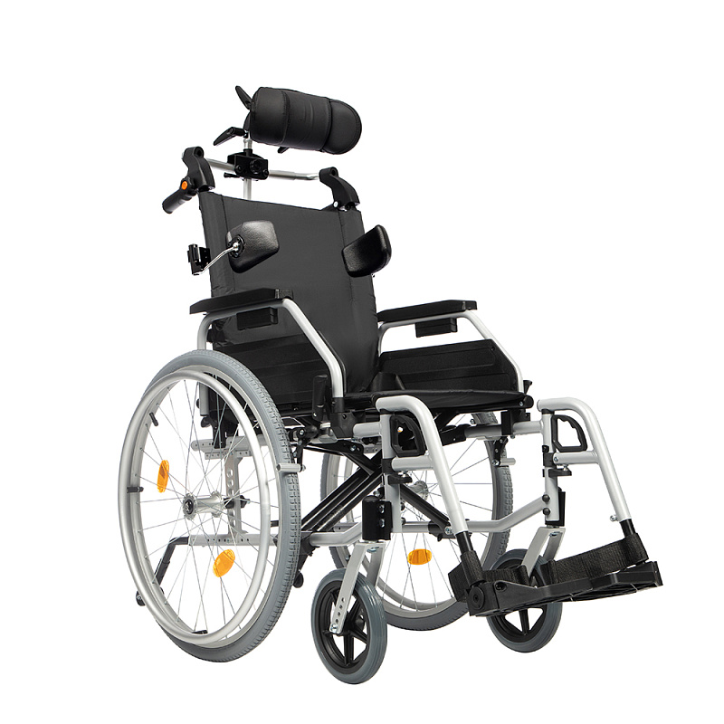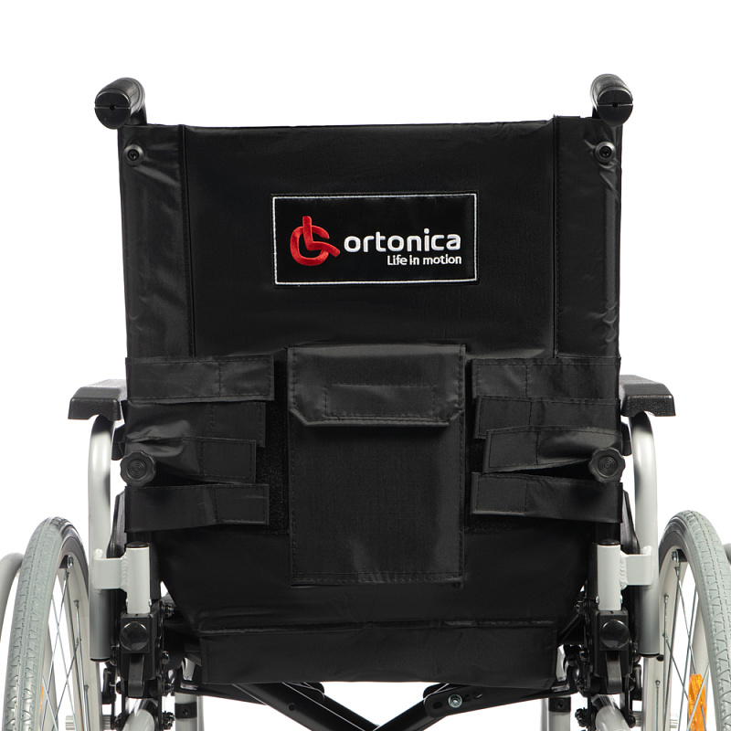 Инвалидная кресло-коляска оснащена ремнями безопасности, ремнями для стоп, карманом для мелочей на спинке.