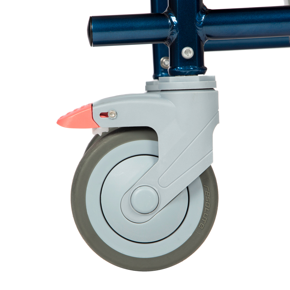 Оснащено цельнолитыми колесами, что облегчает перемещение стула для сопровождающего. Для обеспечения безопасной остановки предусмотрены два стояночных тормоза, расположенные на задних колесах.